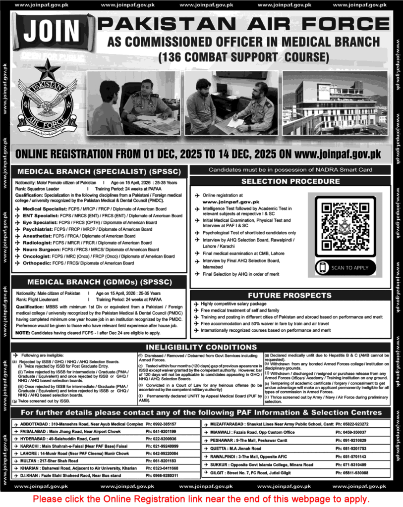 • Join Pakistan Air Force as Commissioned Officers in Medical Branch November 2025 December Online Registration 136 Combat Support Course